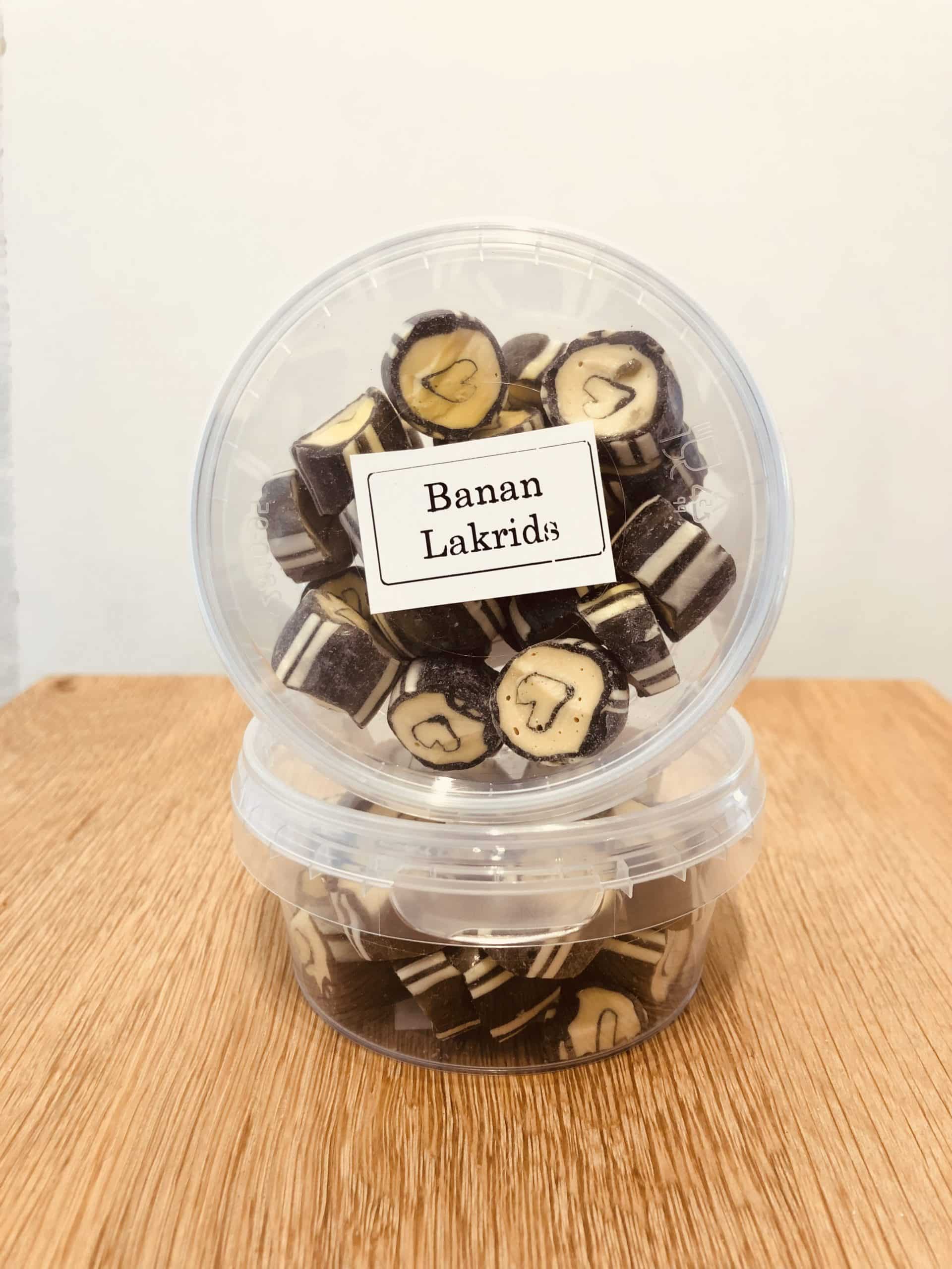 Zucker, Wasser, Glukosesirup, Dextrose-Monohydrat, Farbstoff: E100, E153, Zitronensäure, Bananenaroma, Lakritzpulver.
