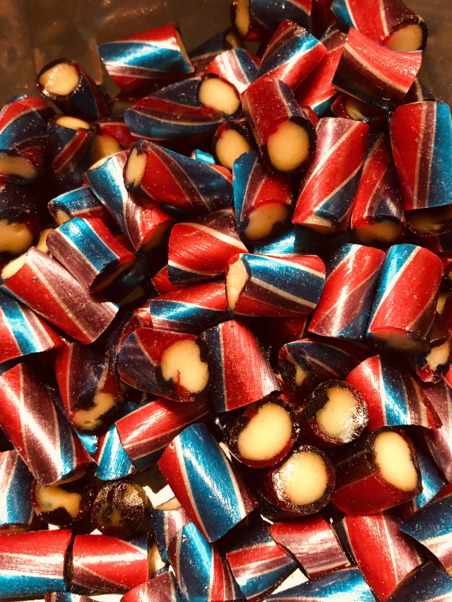 Unsere Bonbons werden aus Glukosesirup, Traubenzucker und Wasser hergestellt. Der von uns verwendete Glukosesirup wird aus Weizen und Gerste gewonnen, aber der Restglutengehalt ist so gering, dass wir unsere Bonbons als glutenfrei bezeichnen dürfen.